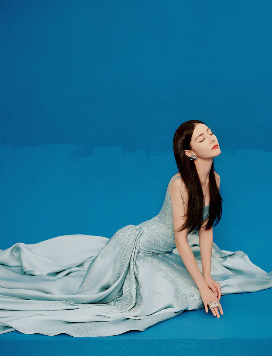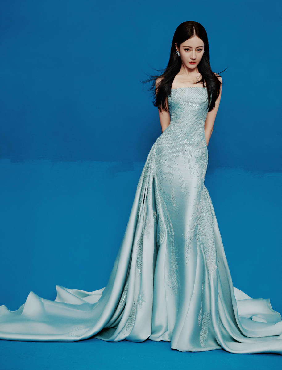 迪麗熱巴仿佛人魚公主探出水面,一襲藍(lán)色禮裙仿佛翻滾的海浪。