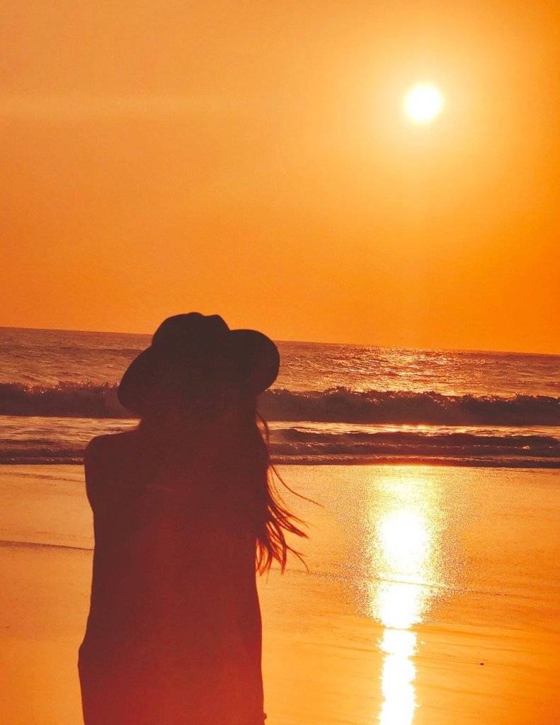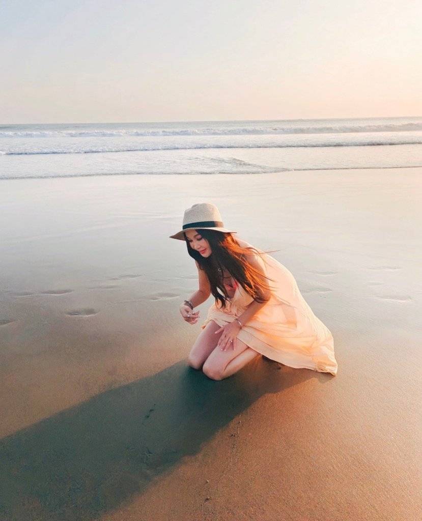 溫碧霞跪在沙灘,戴草帽氣質(zhì)甜美。
