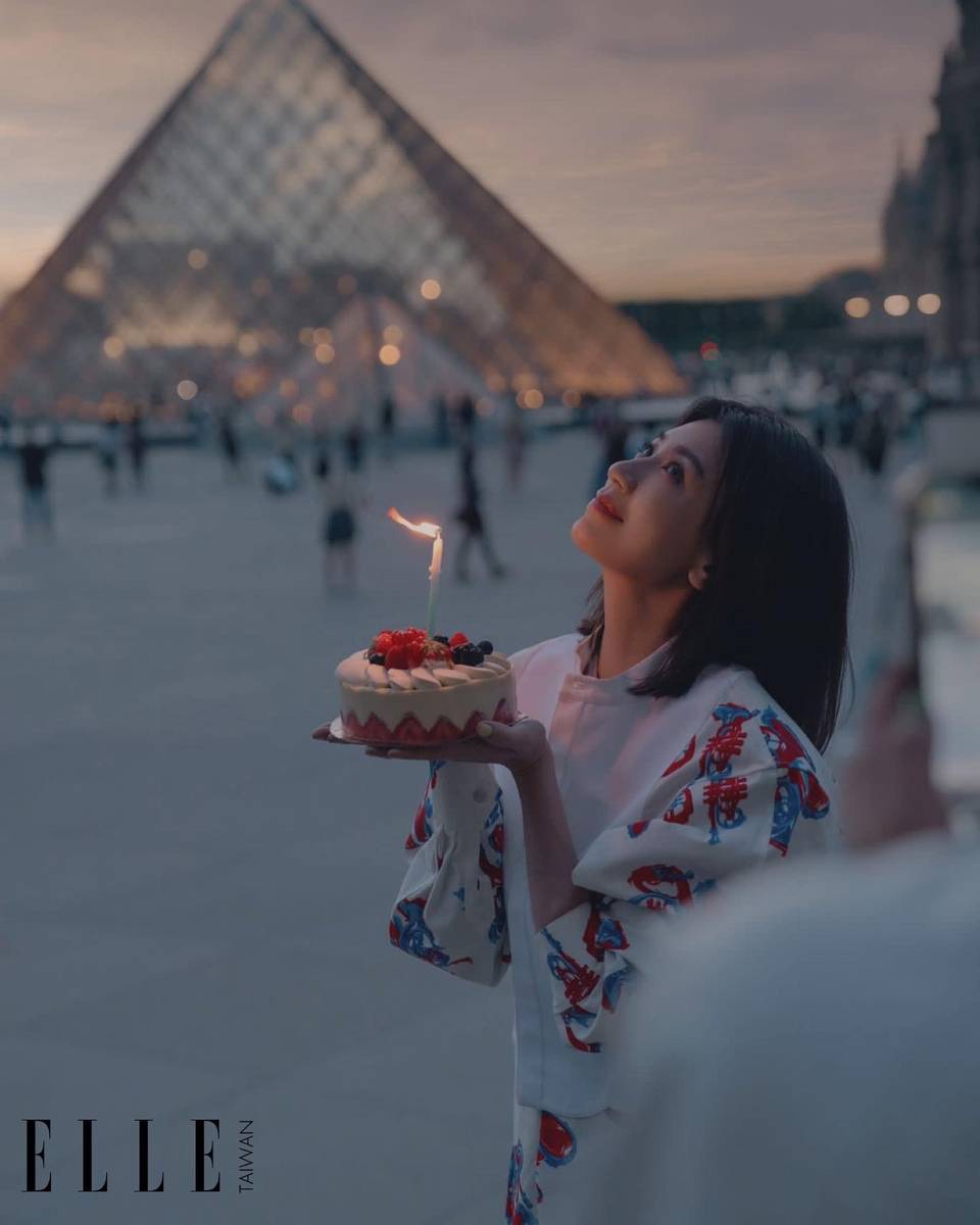 賈靜雯在盧浮宮前慶祝49歲生日。