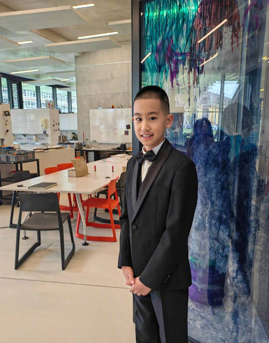 趙文卓和老婆張丹露與兒子的合影,一家人身穿西裝,神清氣爽。