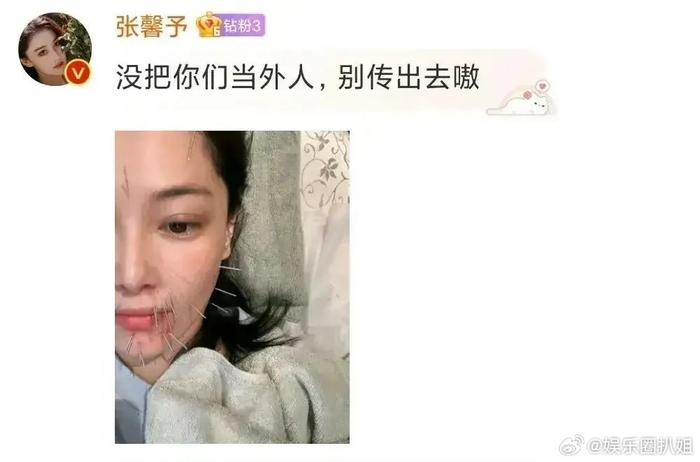 10月30日,張馨予在個(gè)人社交賬號(hào)上曬出做針灸的自拍照,引發(fā)網(wǎng)友關(guān)注。照片中張馨予躺在床上,曬出半張臉,他的臉上插滿了治療用的針,看起來像是刺猬一樣。