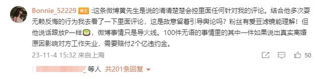 11月3日,黃景瑜前妻王雨馨再度發(fā)文開撕黃景瑜:“你可真是個(gè)油膩的極度利己主義”。3日晚間,她再次發(fā)文表示,當(dāng)初自己念舊情妥協(xié)發(fā)了公關(guān)文,但“你調(diào)頭來變臉說承認(rèn)婚姻影響了你的工作”,還指對(duì)方故意引導(dǎo)對(duì)她不利的輿論。王雨馨稱自己不能說出離婚的真實(shí)原因,“如果說出真實(shí)離婚原因影響對(duì)方工作失業(yè),(她)需要賠付2個(gè)億違約金。”