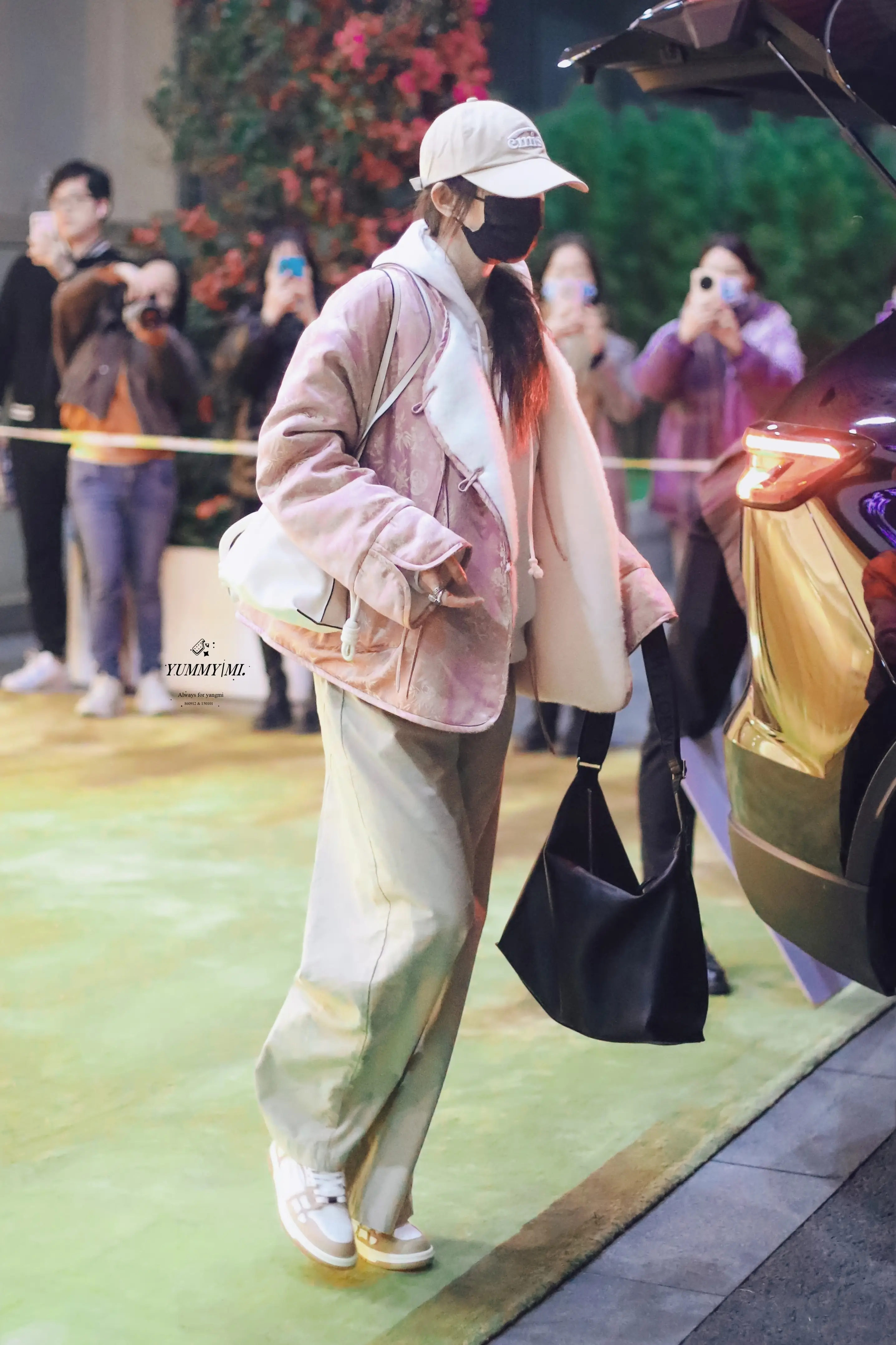 楊冪用白色抽帶細(xì)帶包搭配粉色新中式棉服。