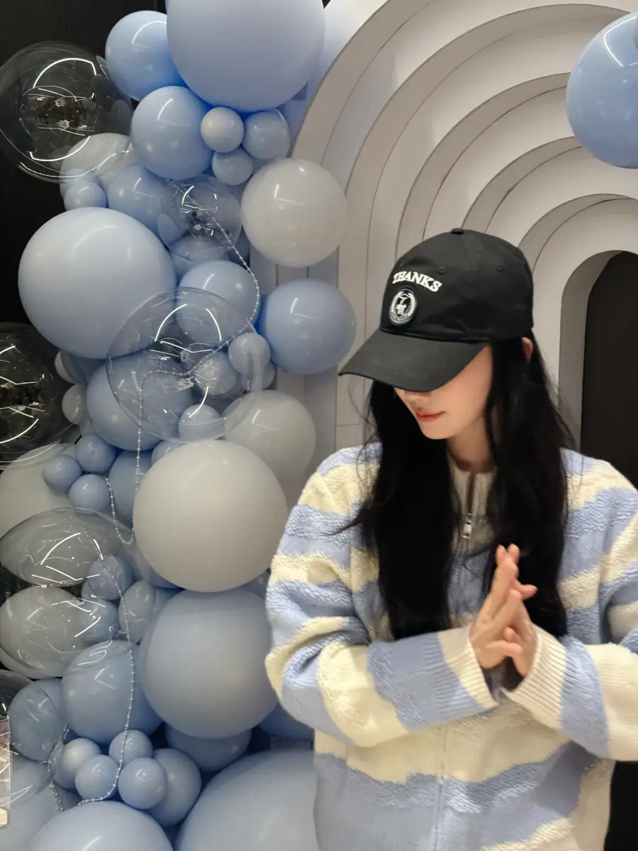 劉詩詩身穿藍白條紋毛衣搭配鴨舌帽。