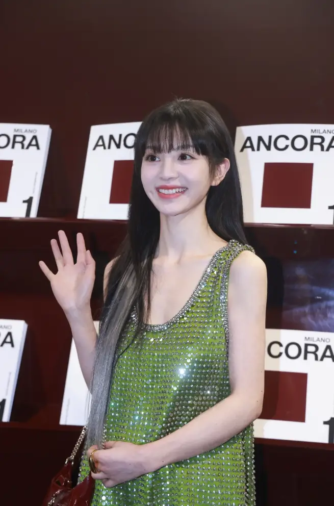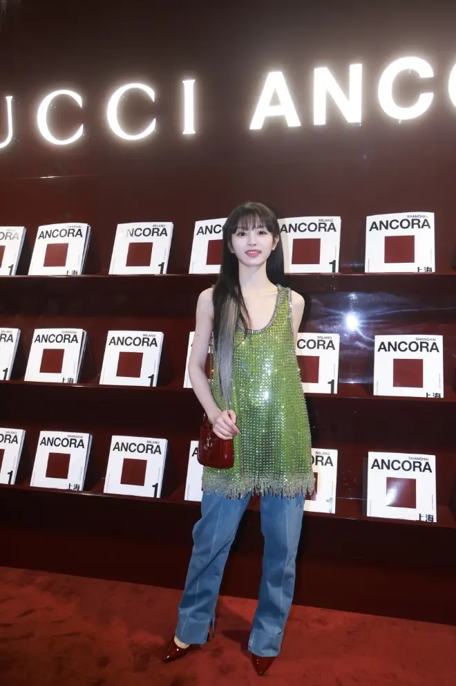 田曦薇以亮片上衣搭配牛仔褲造型登場,青春時(shí)尚。
