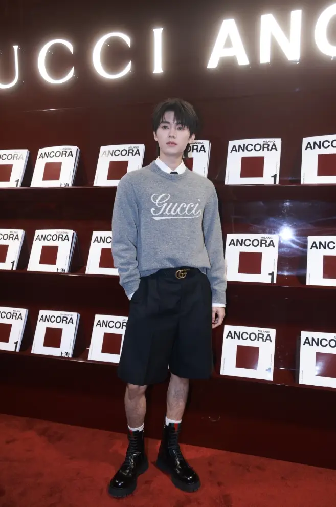 周翊然灰色毛衣搭配黑色短褲,瀟灑不羈。
