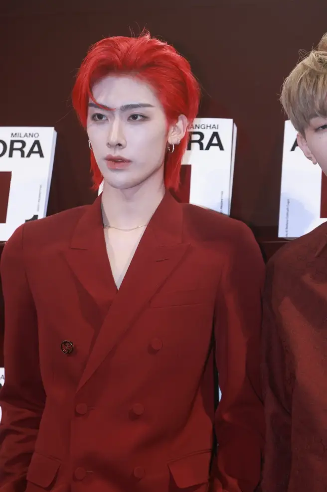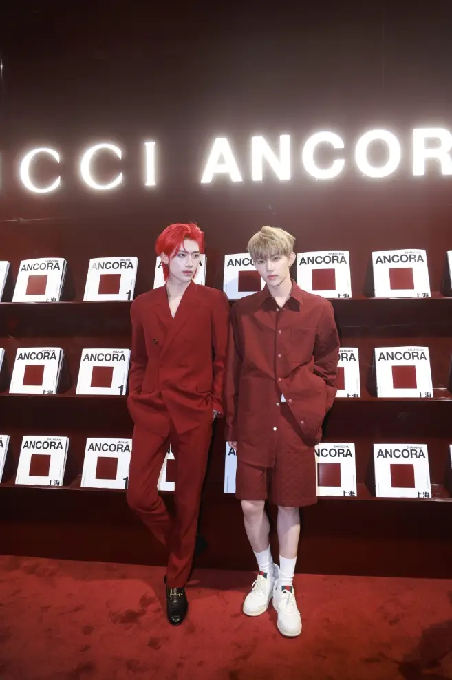 章昊金發(fā)、紅色襯衫的造型超級(jí)惹眼,時(shí)尚潮酷;沈泉銳以紅發(fā)、紅色西裝造型示人,帥得耀眼奪目。