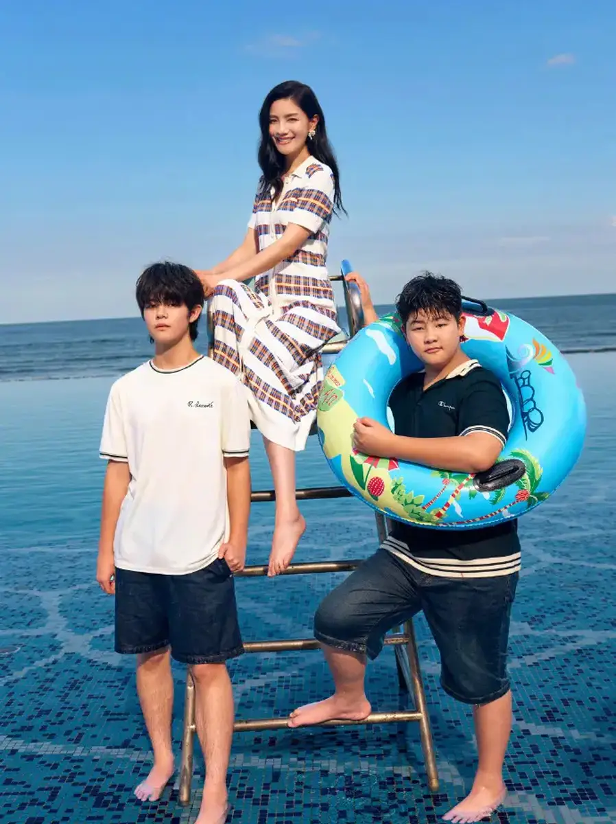 胡可與兩個兒子貼貼合影,畫面溫馨又治愈。