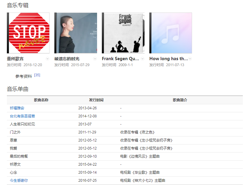 代表作品:臺(tái)北有條圣誕巷、人生若只如初見、大片、中國好聲音第一季、一切無關(guān)緊要的遇見