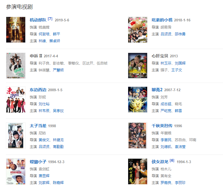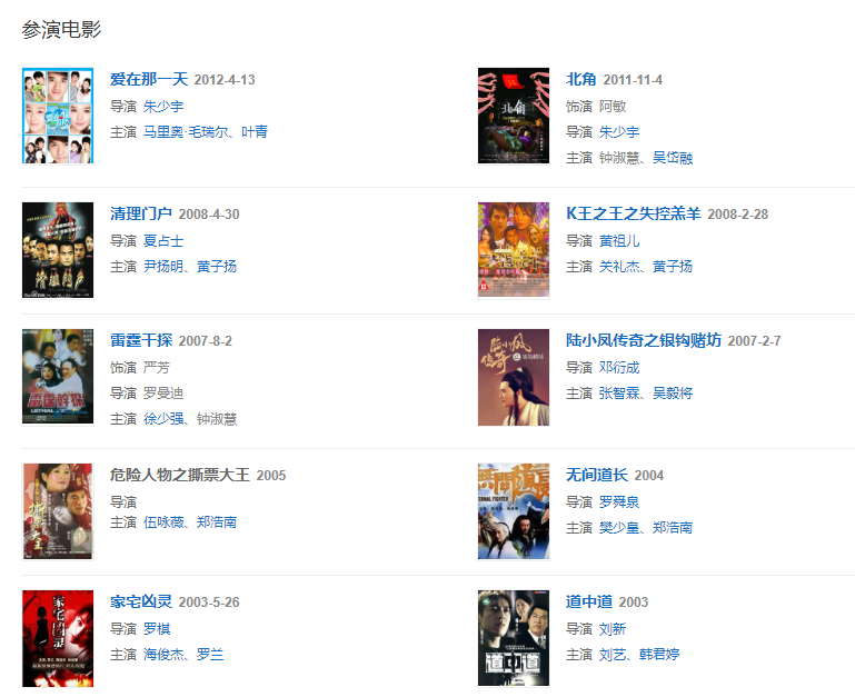 曾參與拍攝了《仙履奇緣》、《古惑女之決戰(zhàn)江湖》、《新男歡女愛》、《水滸英雄傳》、《機(jī)動(dòng)部隊(duì)》和《 龍的天空》等電視劇,電影《白發(fā)魔女》和《古惑女》等。