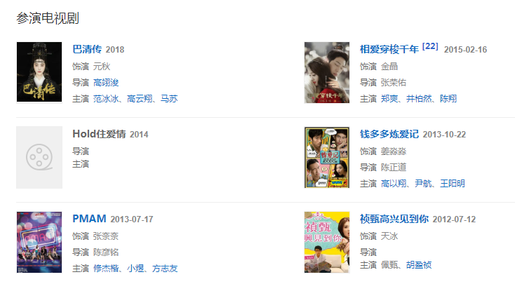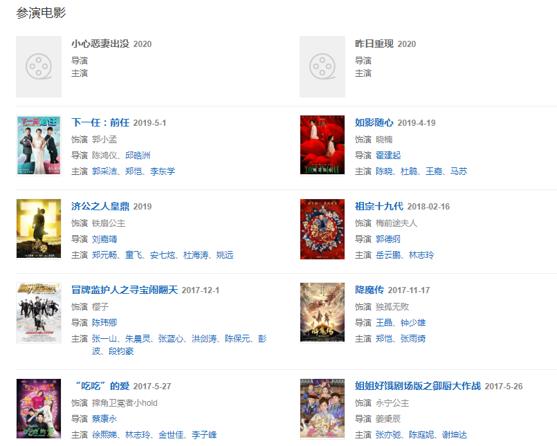 2015年出演的穿越偶像周播劇《相愛穿梭千年》于2月在湖南衛(wèi)視播出, 2015年,出演神話電影《濟(jì)公》扮演鐵扇公主。